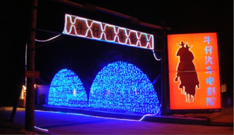 为了突出牛仔主题,“国内首家主题式汽车影院”,经营者煞费苦心,影院在环境和服务上做足了文章:帅气的牛仔组成的影院标识、木制的售票屋、牛仔装扮的服务员以及充满自然气息的特色餐厅无不彰显着自己的个性、突出原生态的时尚品位。据悉,影院20000平米露天草坪能容纳200个观影车位,每天都会同步上映国内外最新大片,平时不限场次循环放映两部影片,周五周六上映三部。国内首家室外面积达160平方米金属屏幕,图像稳定、高清,使观众在不同位置获得逼真的全新感受。值得一提是影院独特的服务模式,进场前根据车内人数发给观众两个萤光棒,在放映过程中如果有任何需要,可以通过挥舞萤光棒的方式向服务员求助。
